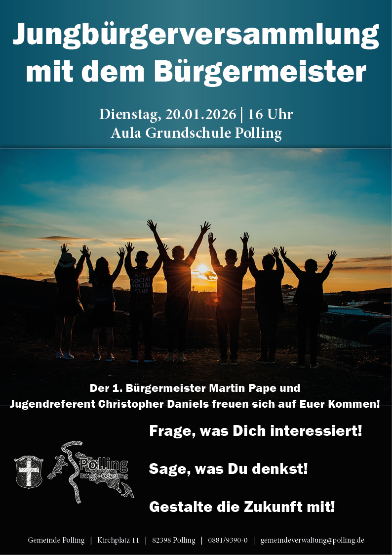 Wir laden euch am 20.01.2025 um 16 Uhr zur Jungbürgerversammlung in die Aula der Grundschule Polling ein. Der 1. Bürgermeister Martin Pape und der Jugendreferent Christopher Daniels freuen sich auf Euer Kommen!